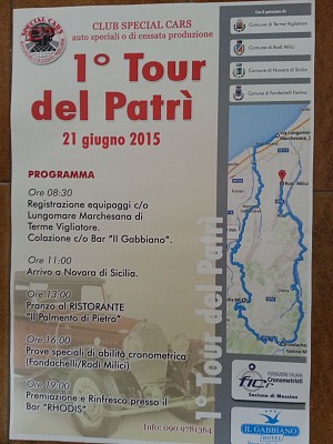 Grande successo per il 1° Tour del Patrì - Raduno per auto d'epoca che si è svolto tra Terme Vigliatore, Novara di Sicilia, Fondachelli Fantina e Rodì Milici. Si ringraziano i 45 equipaggi arrivati da tutta la provincia di Messina e i Comuni ospitanti per la loro disponibilità.