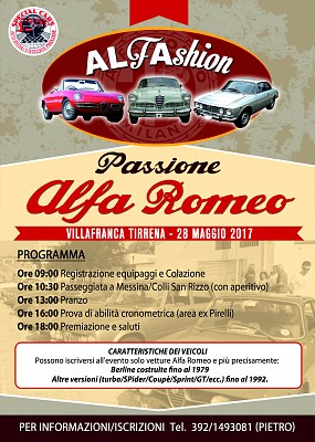 Domenica 28 maggio si terrà un Raduno di auto storiche dedicato alle sole vetture Alfa Romeo. La manifestazione prevede una passeggiata su tutto il litorale da Villafranca a Messina, con sosta in Piazza Cairoli e apertivo. A seguire il rientro a Villafranca Tirrena attraversando i Colli San Rizzo. SUbito dopo il pranzo, prova speciale di abilità cronometrica nell'area ex Pirelli. Grande spazio dunque, per i potenti motori Alfa Romeo.