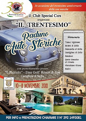 In occasione del 30° anniversario (1988-2018), il Club Special Cars organizza un Raduno per auto storiche, che si svolgerà nell'arco di 2 giorni tra i Nebrodi e le pendici dell'Etna. Location d'eccezione "Il Picciolo Etna Golf Resort & SPA", che permetterà ai partecipanti di godere della natura incontaminata del luogo, di un centro benessere all'avanguardia, di un eccezionale percorso enogastronomico, ecc. ecc..